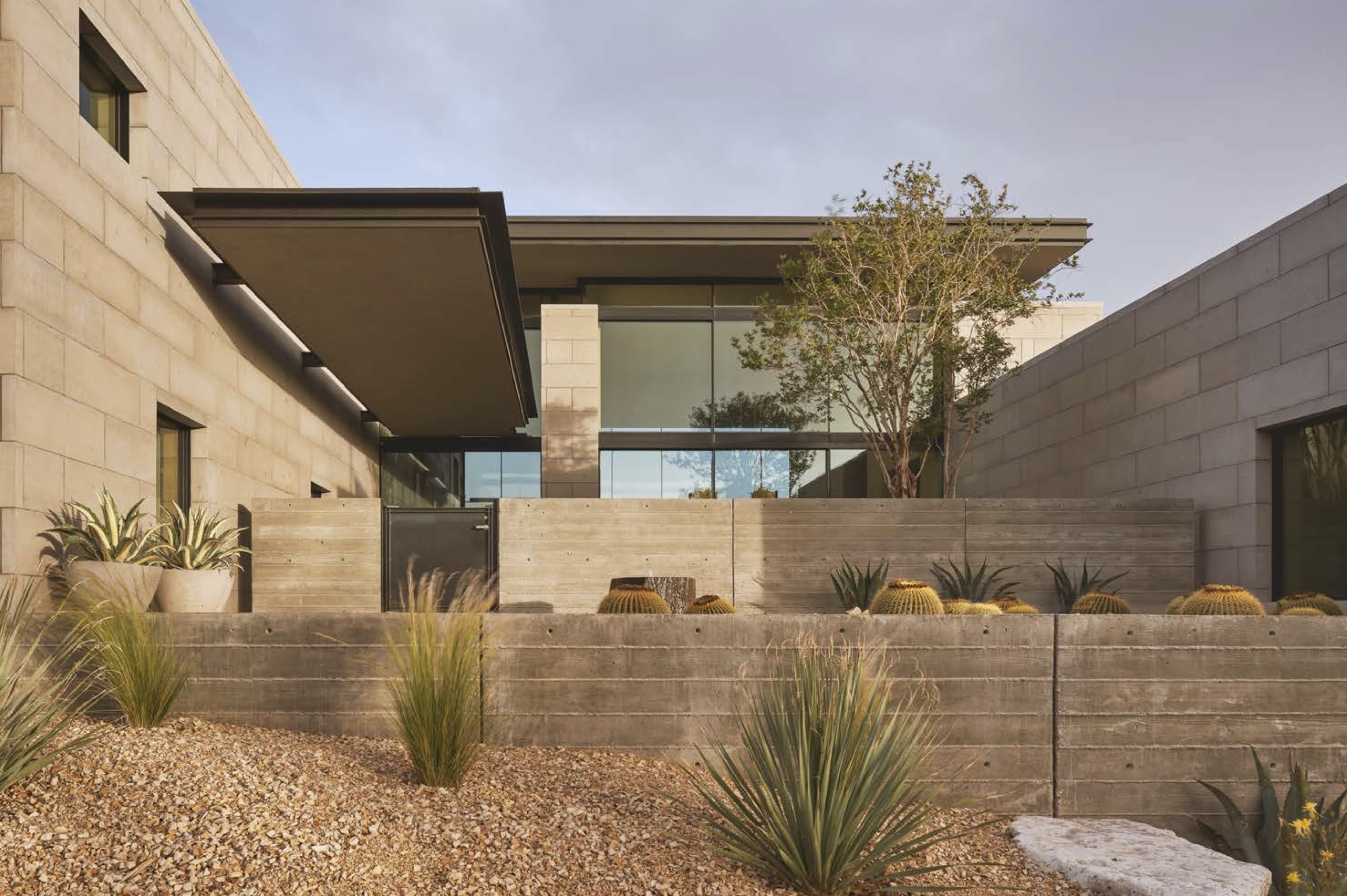 The Broadmoor House is a classically proportioned contemporary home, deeply informed by the sum of what is both imposing and delicate about the inimitable Chihuahuan Desert and its Franklin Mountain backdrop. To the north, the home’s glass entryway sits atop a terraced courtyard, opening into large light-filled spaces where family can gather amongst a collection of paintings and sculpture. The Living Room is a defining pavilion that sets the tone for either quiet contemplation or exuberant celebration, taking its dwellers from sunrise to sunset throughout the colorful desert season. Many of the home’s rooms feature high ceilings, maintaining propriety with strong horizontal lines and astute use of material transitions.